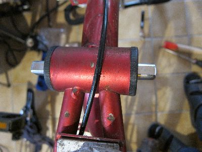 Hier ist schon die linke Kurbel runter. Das Gewinde hier ist linksrum, und die Mutter hat SW26. Nichts was man so eben rumliegen hat, aber heute morgen war ja Flohmarkt. Eine Rohrzange verhunzt nur die Mutter.
