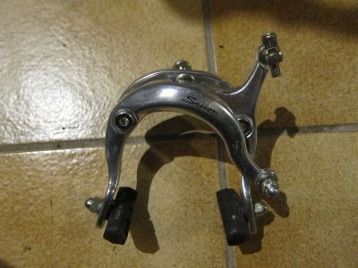 Fündig wurde ich bei Saccon. Die haben doch tatsächlich eine Doppelgelenkbremse mit einigermaßen ausreichender Steifigkeit. Mit guten Zughüllen und Bremshebeln bekommt man damit eine halbwegs brauchbare Bremsanlage. Leider sind außer 45mm Bolzenlänge alle anderen Längen auf Anfrage, so daß man im Handel nur diese Variante bekommt. Glücklicherweise ist der Bolzen eine einfache M6-Schloßschraube, die sich problemlos rausklopfen und durch andere Längen ersetzen lässt. Ein Tipp für alle, die einen Rahmen mit sattem Reifendurchlauf haben.